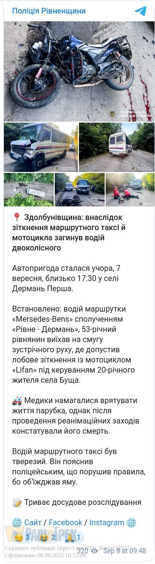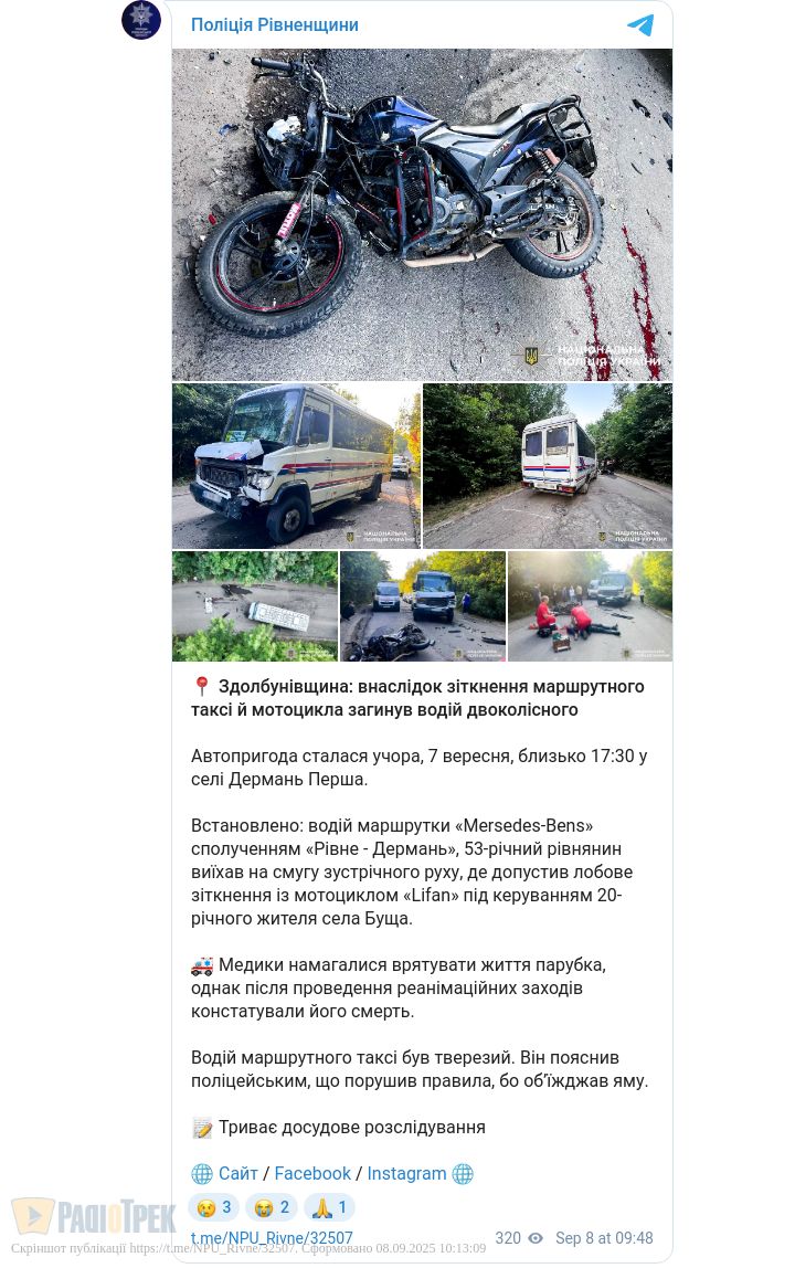 Вчора, в селі Дермань Перша, маршрутка виїхала на зустрічну смугу та зіткнулася з мотоциклом, яким керував 20-річний юнак.