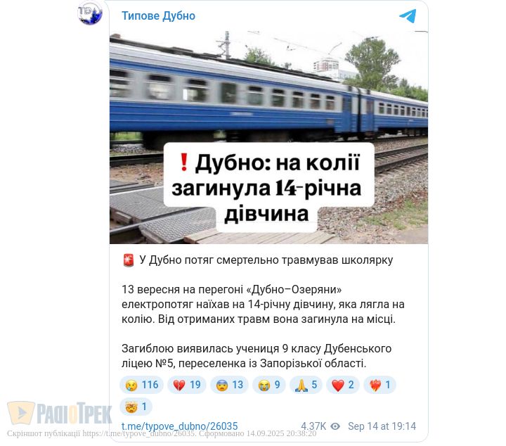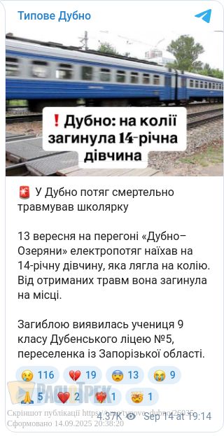 13 вересня на перегоні «Дубно–Озеряни» сталася трагедія — електропотяг наїхав на 14-річну дівчину. Як повідомляє місцевий телеграм-канал Типове Дубно, школярка лягла на колію.