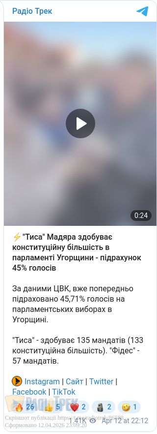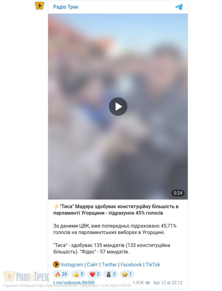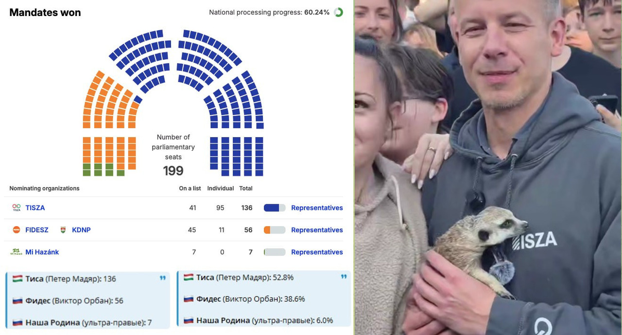 Станом на вечір 12 квітня 2026 року, за попередніми результатами (підраховано 60% голосів), опозиційна партія «Тиса» (Tisza) під керівництвом Петера Мадяра здобуває впевнену перемогу.