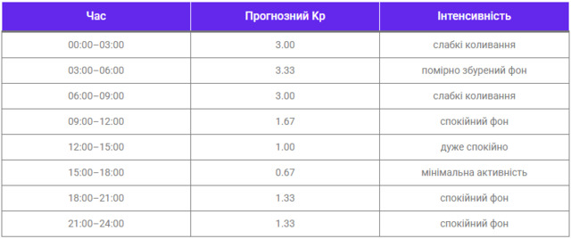 За прогнозом Центру прогнозування космічної погоди NOAA, максимальний індекс Kp складе 3,33, що значно нижче порога для магнітної бурі (Kp=5).