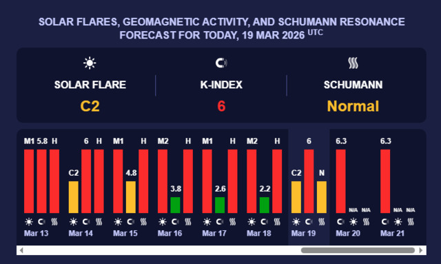 20 березня очікується підвищена сонячна активність із К-індексом 6,3 — це сильна магнітна буря, яка може впливати на самопочуття.