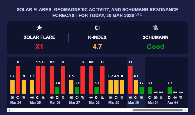 У вівторок, 31 березня, очікується спокійна сонячна активність: К-індекс прогнозують на рівні 3,7 (зелений рівень), що відповідає слабким бурям.
