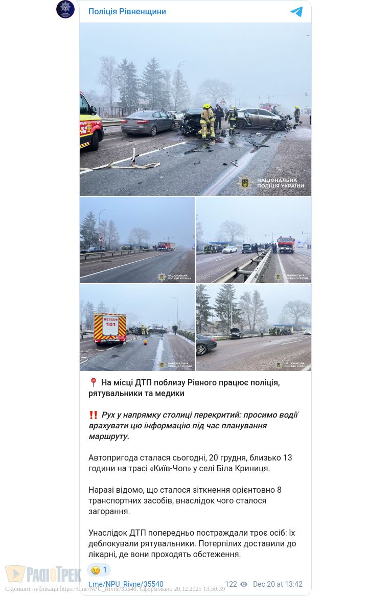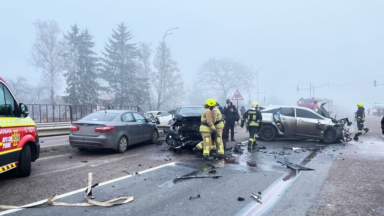 Неподалік Рівного зіткнулися 8 автомобілів, внаслідок чого виникло загорання. Автопригода сталася сьогодні, 20 грудня, близько 13 години, на трасі «Київ-Чоп» у селі Біла Криниця.