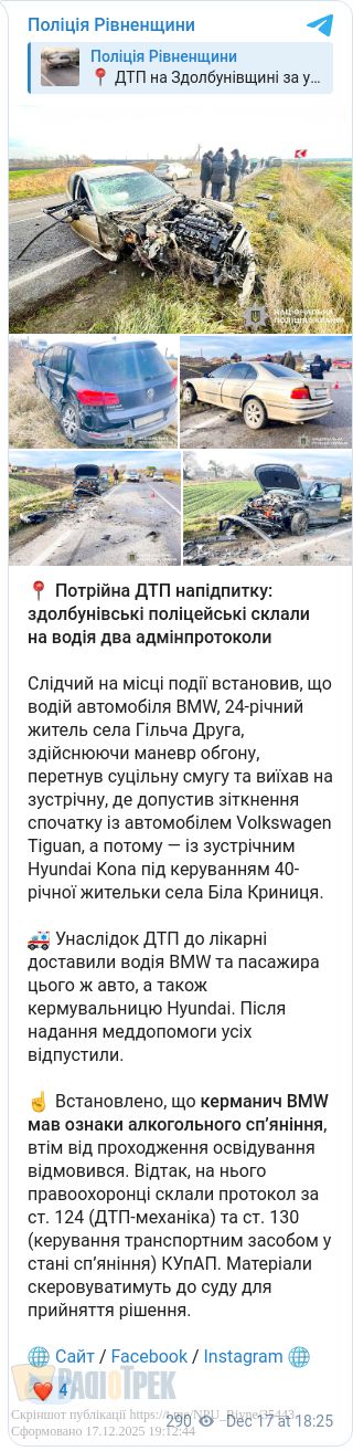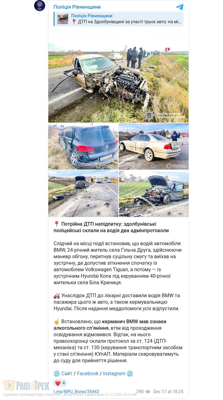 Масштабна автотроща: п’яний водій BMW спричинив потрійну ДТП на Здолбунівщині