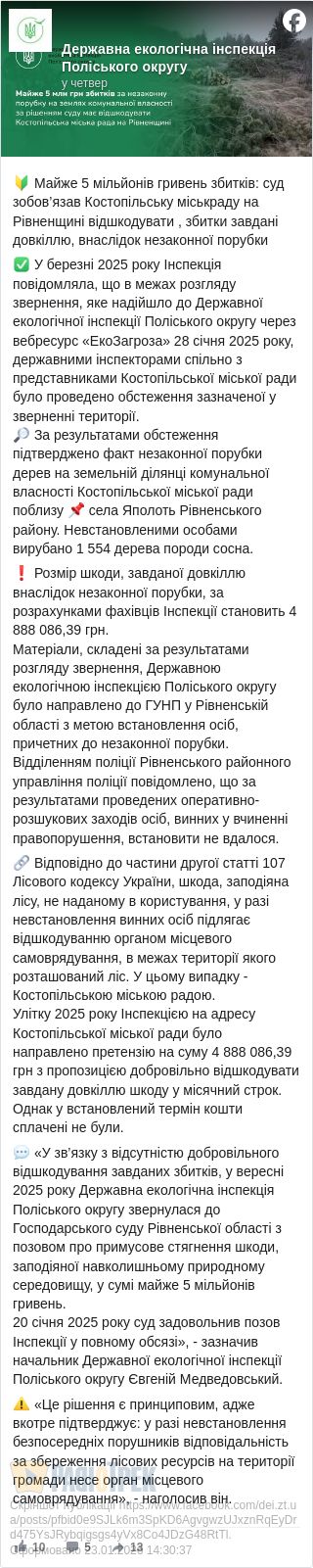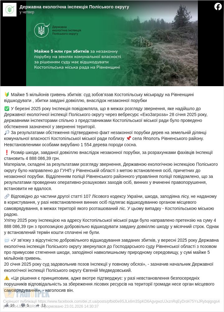 Суд зобов’язав Костопільську міськраду відшкодувати майже 5 000 000 грн за шкоду довкіллю через незаконну порубку дерев.
