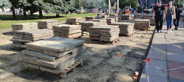Роботи тривають сьогодні протягом усього дня. Старі плити та бруківку прибирають і викладатимуть нові.