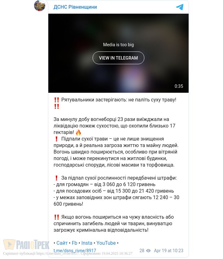 Вогнеборці краю нагадують, що підпали сухої трави – це не лише знищення природи, а й загроза життю та майну людей. Оскільки вогонь швидко поширюється і може перекинутися на житлові будинки, господарські споруди, лісові масиви та торфовища.