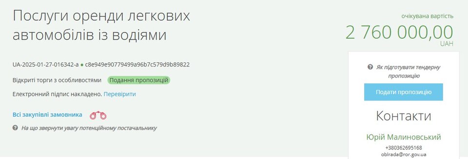 У документі йдеться, що Рівненська обласна рада укладе угоду на послуги оренди легкових автомобілів із водіями для перевезення керівництва.