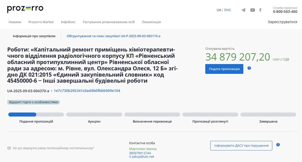 Майже 35 мільйонів гривень планують витратити на ремонт у Рівненському обласному протипухлинному центрі. Такий тендер оголосили на сайті Прозорро.