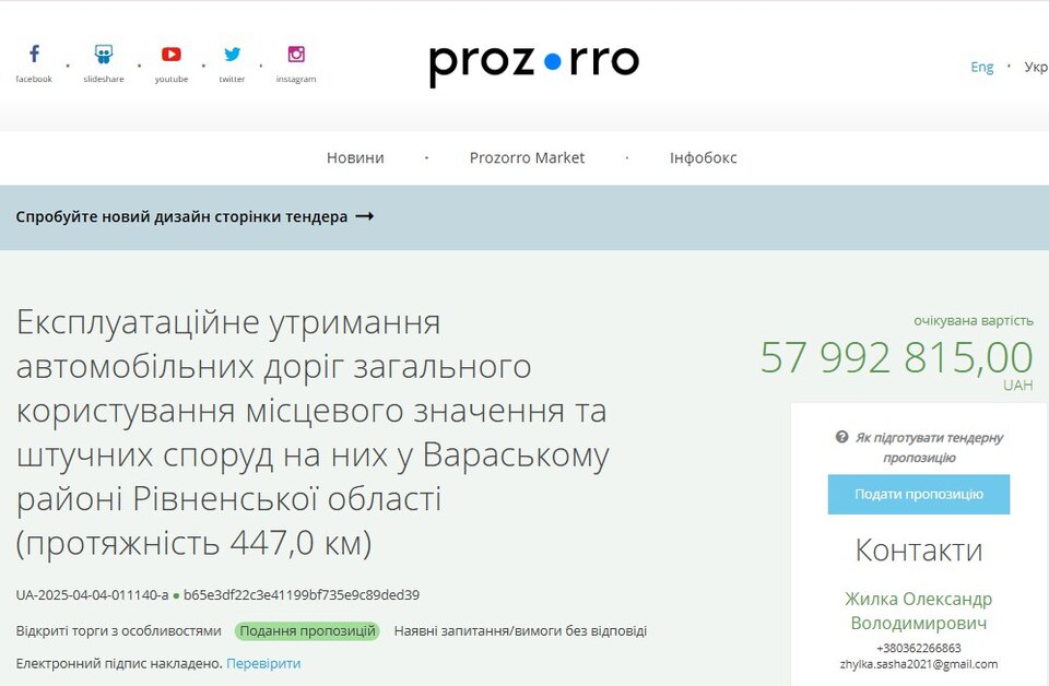 Майже 58 мільйонів гривень витратять на ремонт автомобільної дороги у Вараському районі. Такий тендер днями оголосили на сайті Прозорро.