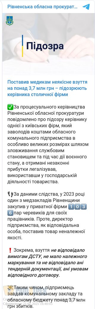 Товар не відповідав вимогам ДСТУ, не мав належного маркування, не відповідав тендерній документації та умовам укладеного договору. Керівнику компанії, яка поставила неякісний товар, повідомили про підозру та відправили під домашній арешт.