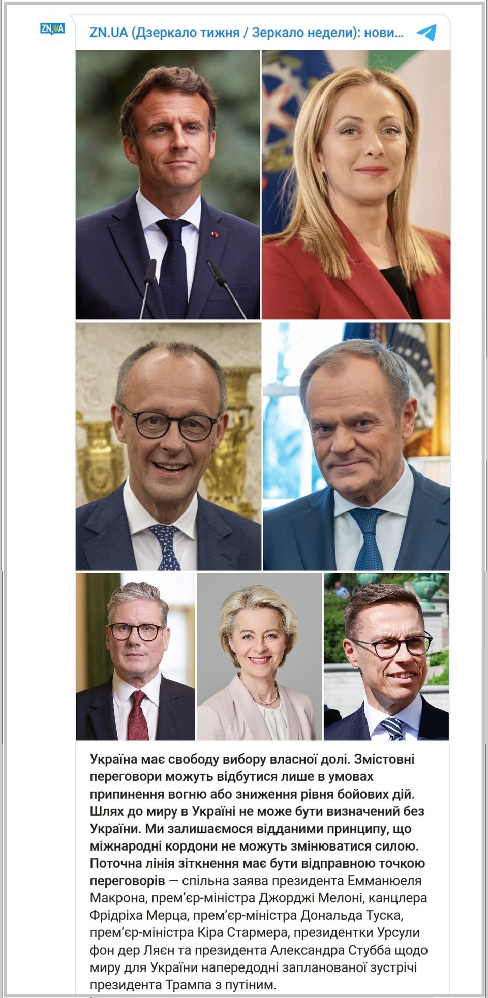 Очільники провідних європейських держав оприлюднили звернення, яким закликали президента США Дональда Трампа проводити переговори з правителем Росії Володимиром Путіним щодо завершення війни в Україні лише за умови припинення вогню та гарантій захисту «життєво важливих інтересів безпеки України та Європи».