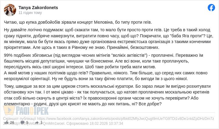 Тепер у соцмережах можна прочитати, що «Рівне вкрило себе довічною ганьбою» через зрив концерту ЛГБТ-артиста, а дехто навіть переконаний, що й сам «протест» був організований із Москви – спецслужбами Путіна.