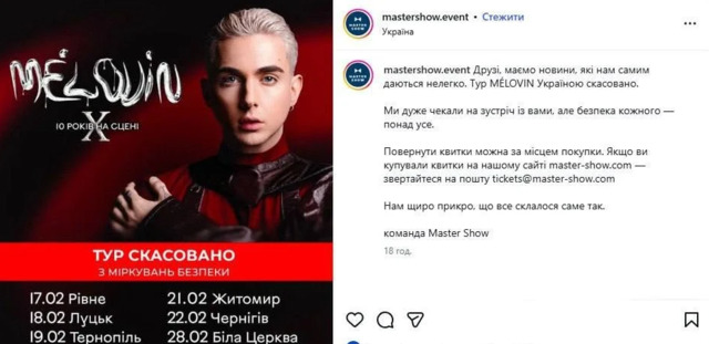 Співак MELOVIN припинив свій концертний тур українськими містами.