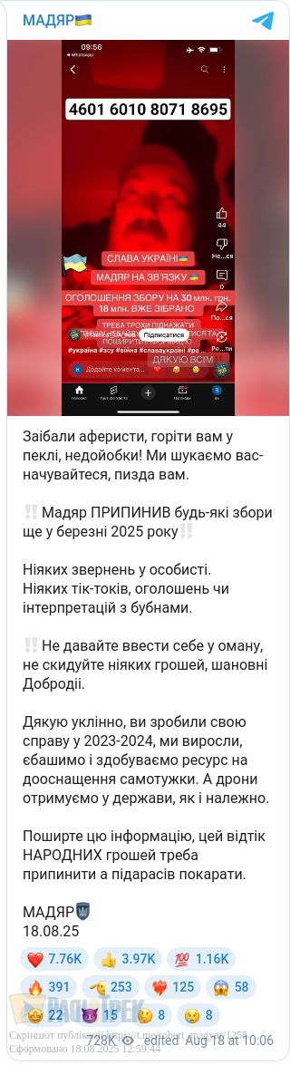 «Ми не збираємо ніяких грошей»: Мадяр повідомив, що розшукує аферистів (ФОТО)