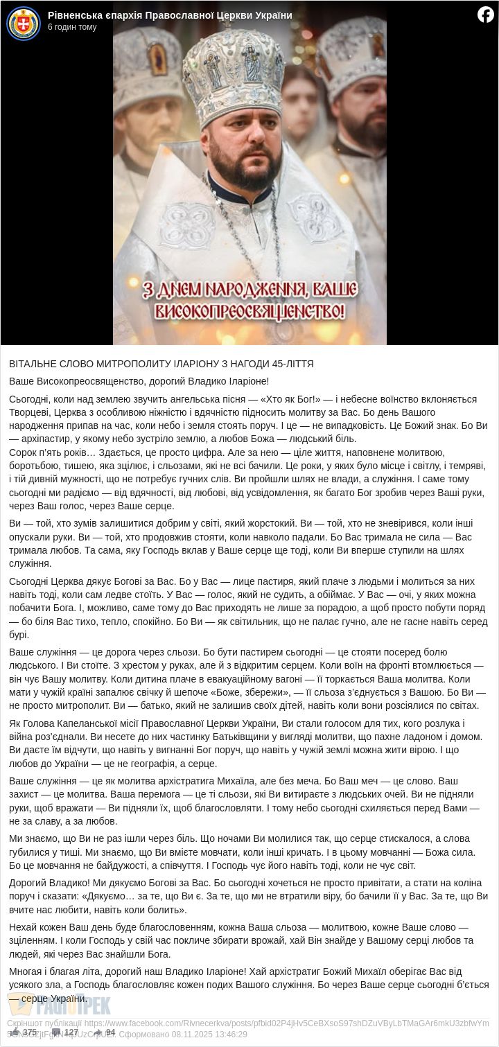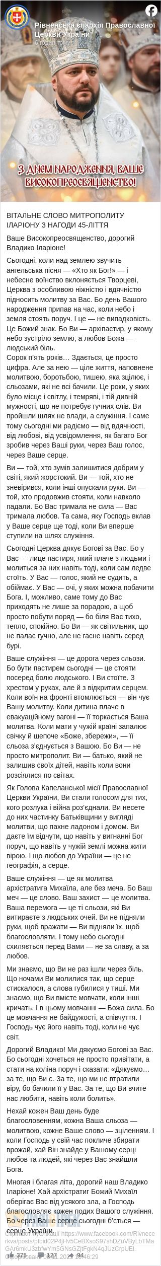 На сторінці Рівненської Єпархії ПЦУ сьогодні з’явилося привітання, адресоване Митрополиту Рівненському та Острозькому Іларіону.