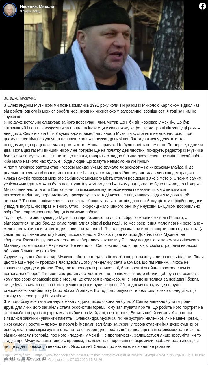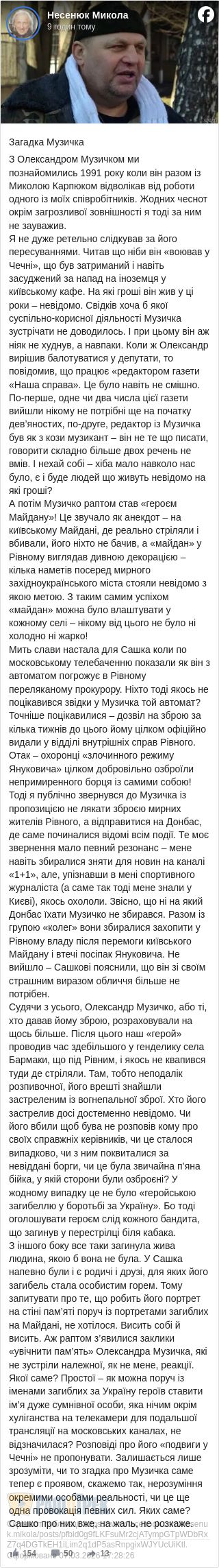 Свіжий його допис стосується Олександра Музичка. Реакція, яку він викликав, правильно, напевно, назвати «неоднозначною».