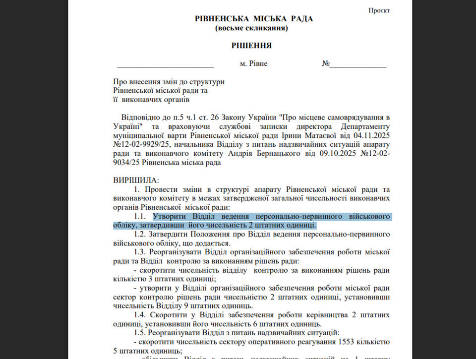 Допомогу Рівненському ТЦК у веденні військового обліку планує надати міська влада Рівного. Про це йдеться в проєкті рішенні, який нещодавно опублікували.