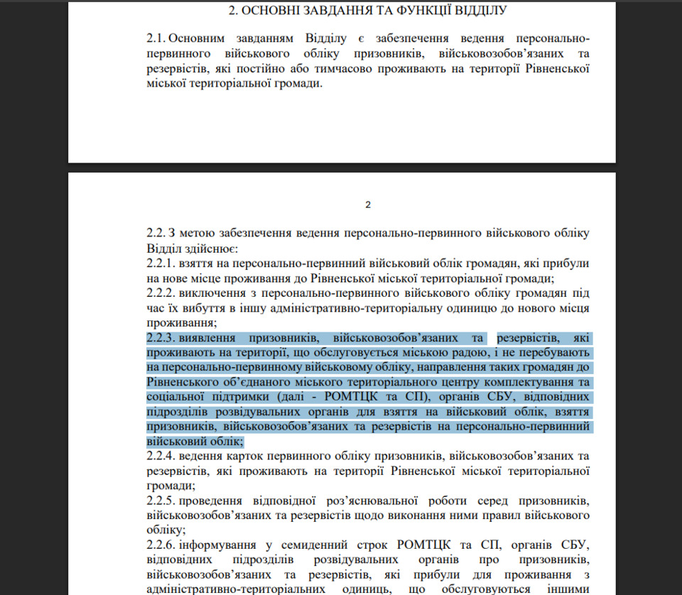 виявлення призовників, військовозобов’язаних та резервістів, які проживають на території, що обслуговується міською радою, і не перебувають на персонально-первинному військовому обліку, направлення таких громадян до Рівненського об’єднаного міського територіального центру комплектування та соціальної підтримки (далі - РОМТЦК та СП), органів СБУ, відповідних підрозділів розвідувальних органів для взяття на військовий облік, взяття призовників, військовозобов’язаних та резервістів на персонально-первинний військовий облік.