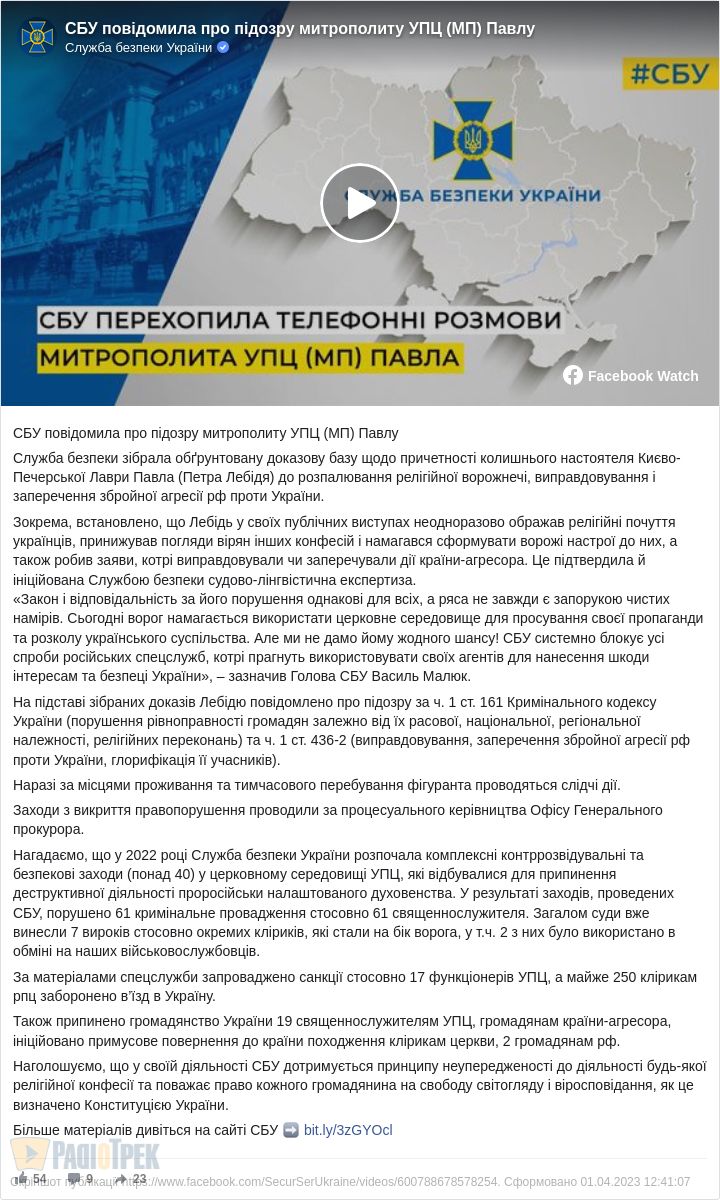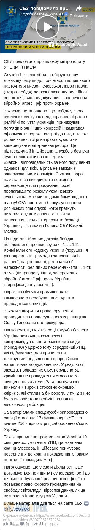 Служба безпеки України зібрала необхідну кількість доказів щодо причетності колишнього настоятеля Києво-Печерської Лаври Павла (Петра Лебедя) до розпалювання релігійної ворожнечі, виправдовування і заперечення збройної агресії рф проти України. У зв’язку з цим митрополиту повідомили про підозру.