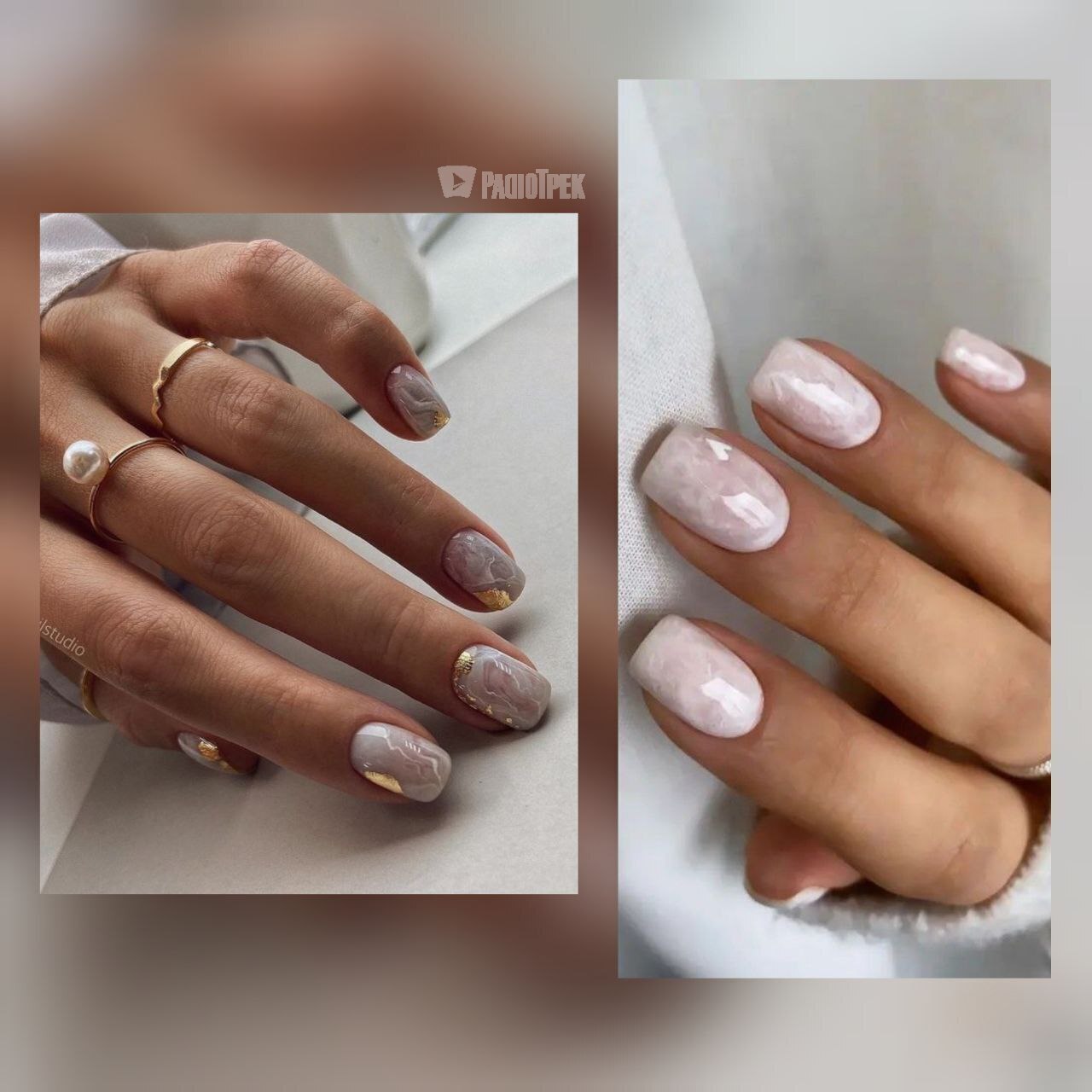 Тренд, який не втрачає актуальності, – це імітація мармуру на нігтях. Переплетення білих, сірих та золотистих прожилок створює ефект дорогого каменю. Такий манікюр виглядає розкішно і водночас стримано.