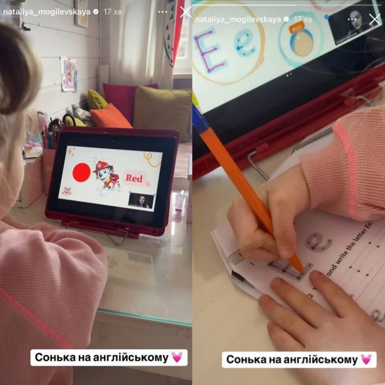 Зіркова мама показала, як минає одне з занять 4-річної дівчинки. На кадрах є Софійка та репетитор, з якою вона переглядає слайди та вивчає нові іноземні слова. Також, на фото можна побачити, як донька Могилевської вчиться писати виводити літери з англійської абетки.