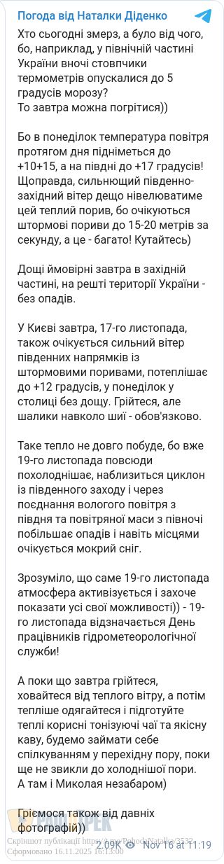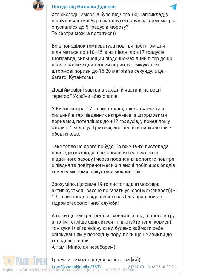 Зрозуміло, що саме 19-го листопада атмосфера активізується і захоче показати усі свої можливості – 19-го листопада відзначається День працівників гідрометеорологічної служби, – зауважила синоптик Наталка Діденко.