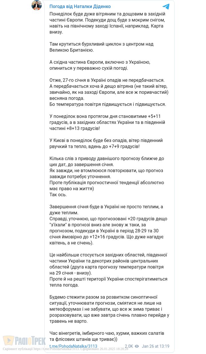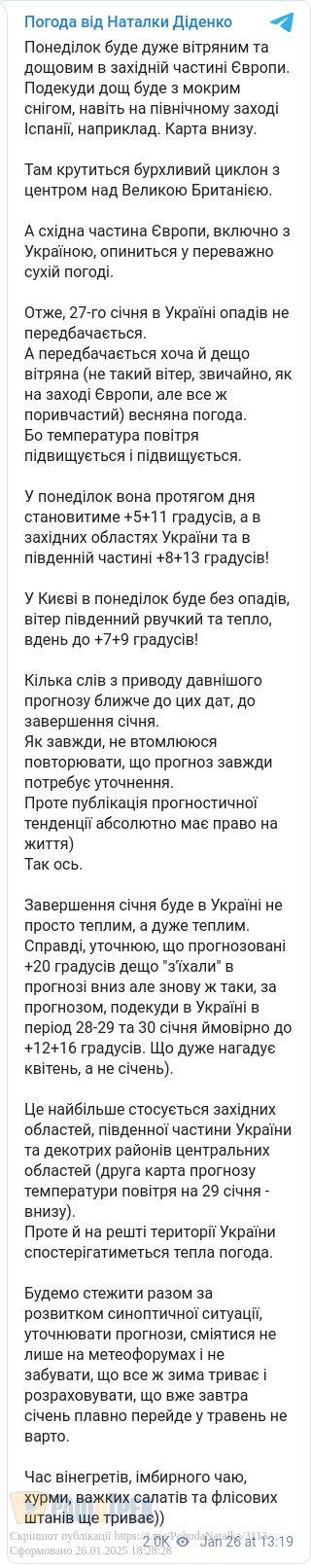 В останні дні січня температура повітря, ймовірно, підвищиться ще дужче. В деяких регіонах можливі +12...+16 градусів.