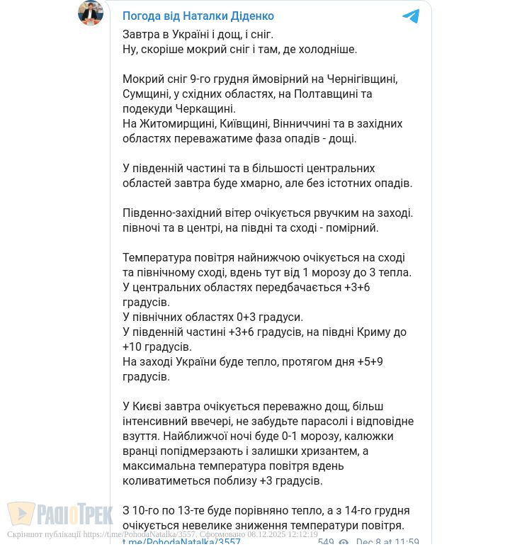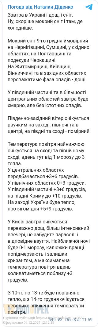 Завтра, 9 грудня, в Україні очікується волога погода. В областях пройде дощ та мокрий сніг, повідомила синоптик Наталка Діденко.