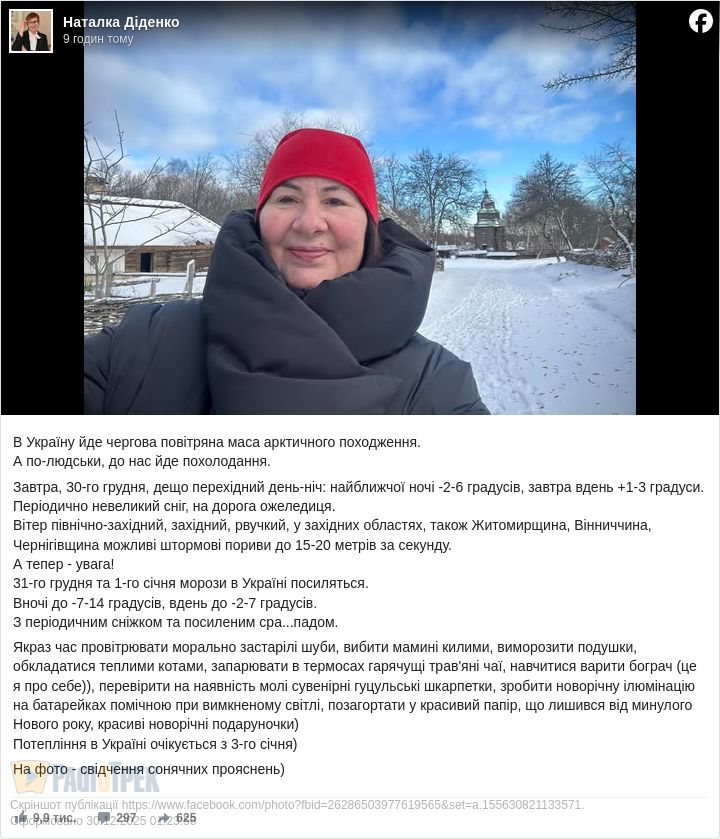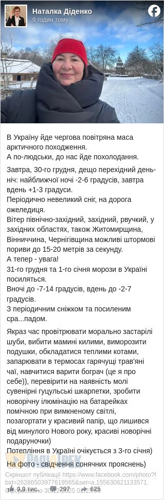 Морози посиляться 31 грудня та 1 січня. Вночі буде до -7...-14 градусів, а вдень очікується до -2...-7 градусів. Про це повідомила синоптик Наталка Діденко.