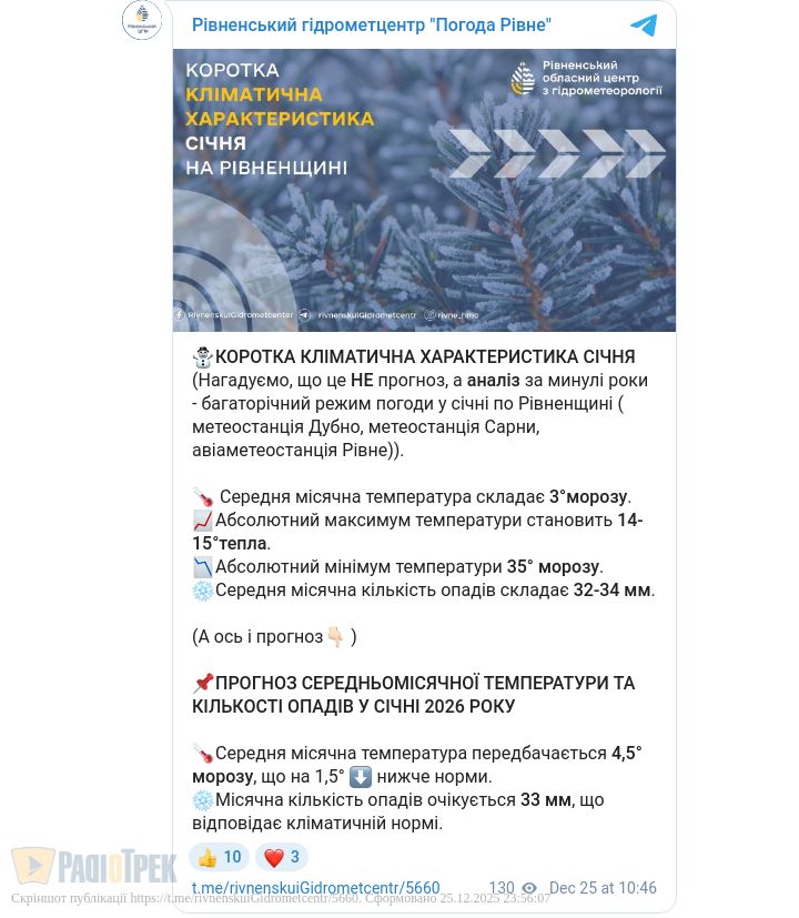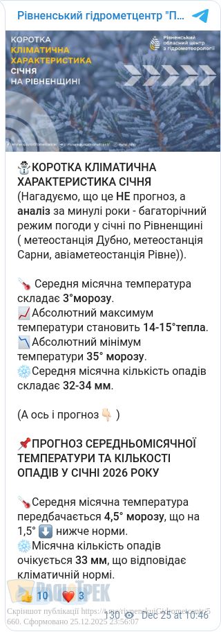 Січень 2026 року буде холодним. Про це йдеться у попередньому прогнозі від Рівненського обласного гідрометцентру.