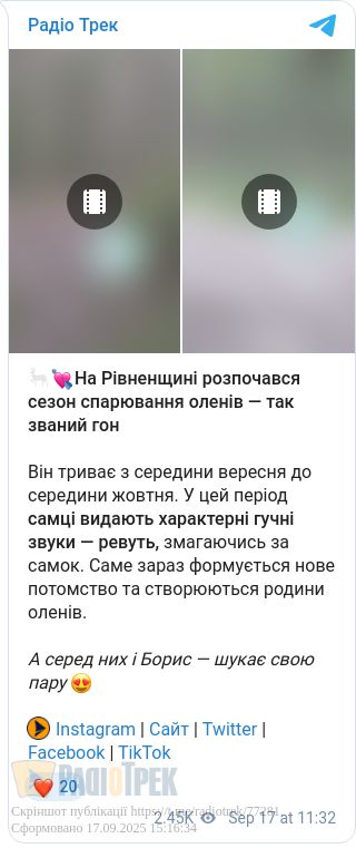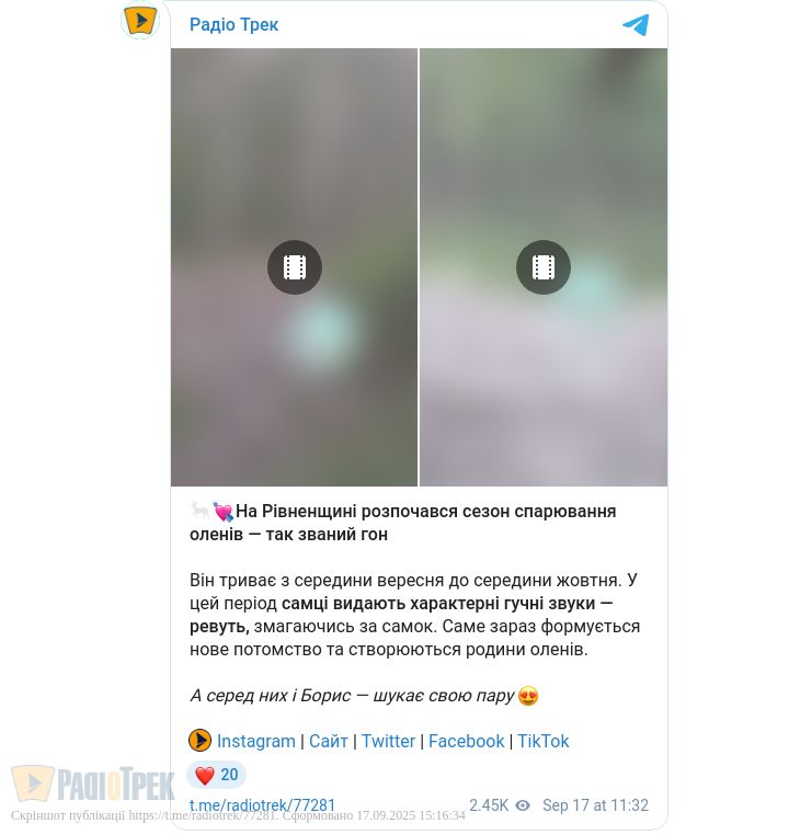 Зірка Рівненщини – олень Борис, покинув вулиці Зарічного і повернувся до лісу. У благородних оленів розпочався шлюбний період - гон, характерною ознакою цього є ревіння самців.