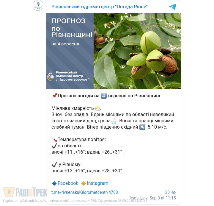 На Рівненщині 4 вересня очікується мінлива хмарність. Вночі опадів не передбачається, проте вдень можливий невеликий короткочасний дощ та гроза у деяких районах області.