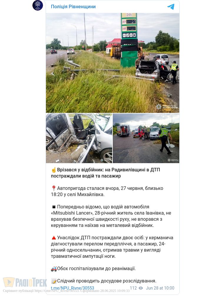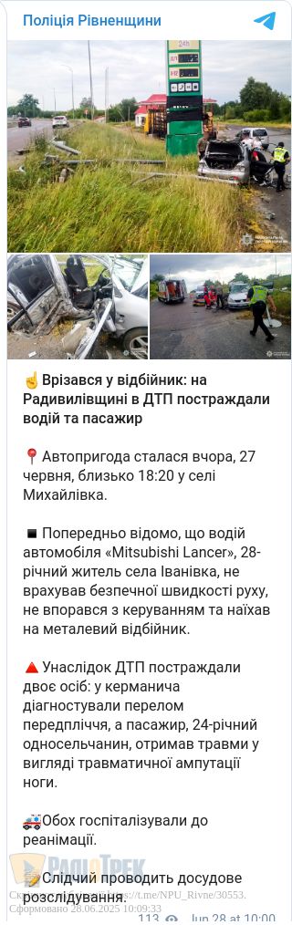 Близько 18:20 в селі Михайлівка 28-річний водій автомобіля Mitsubishi Lancer, не врахувавши безпечної швидкості руху, не впорався з керуванням та наїхав на металевий відбійник, повідомили у відділі комунікації поліції Рівненщини.