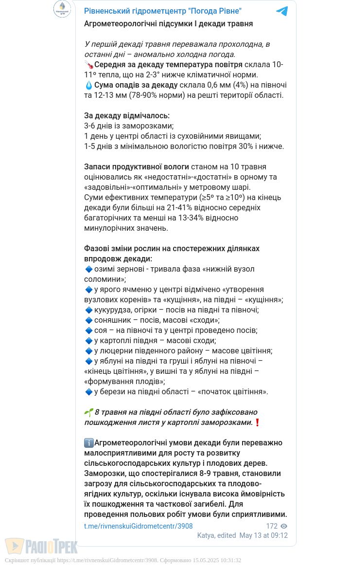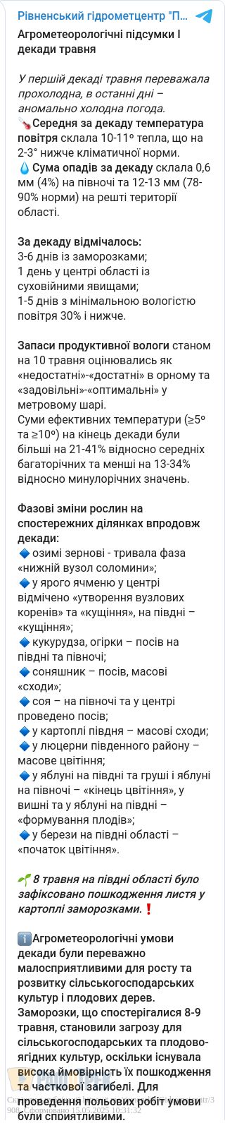 Крім того, як повідомили в обласному гідрометцентрі, 3-6 днів в Рівненській області панували заморозки, що призвело до пошкодження деяких культур. Зокрема, 8 травня на півдні області було зафіксовано пошкодження заморозками листя картоплі.