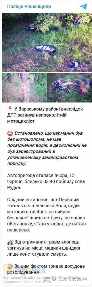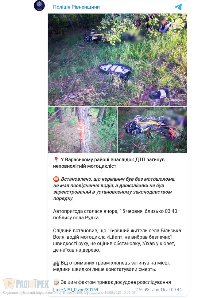 Напередодні близько 3:40 поблизу села Рудка 16-річний водій мотоцикла Lifan не вибравши безпечної швидкості руху та не оцінивши обстановку, зʼїхав у кювет, де наїхав на дерево.