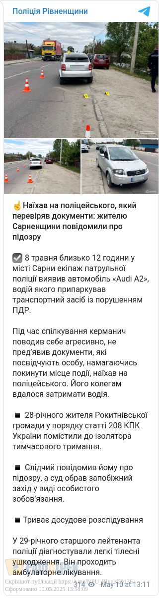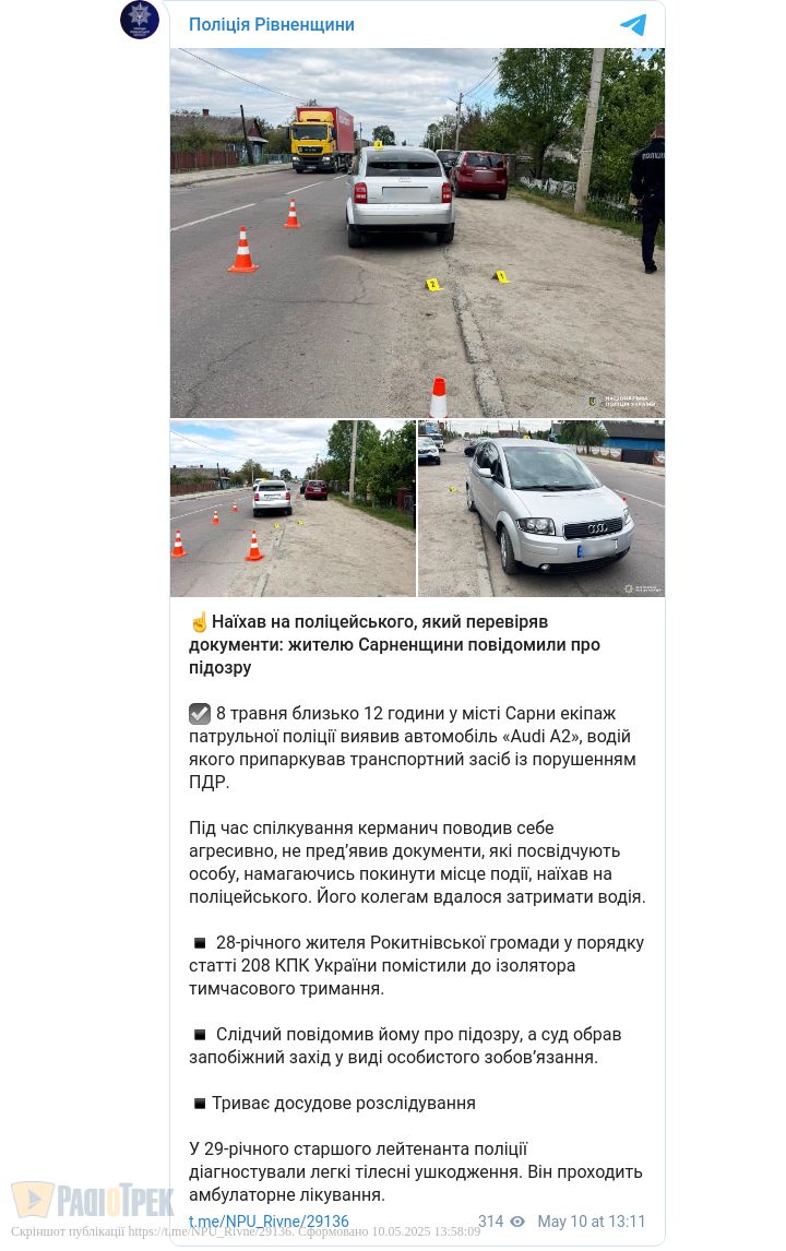 Відомо, що у 29-річного старшого лейтенанта поліції діагностували легкі тілесні ушкодження. Нині він проходить амбулаторне лікування, повідомили у відділі комунікації поліції Рівненщини.