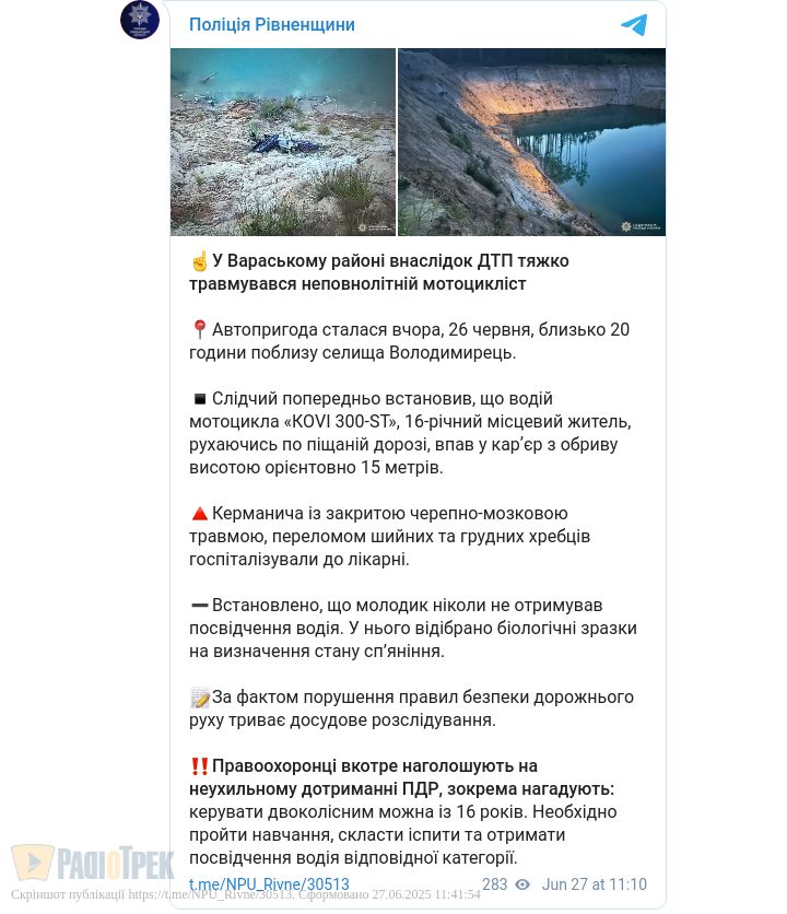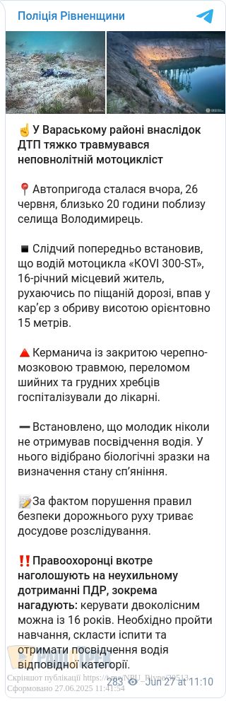 Як повідомили у відділі комунікації поліції області, 16-річний водій мотоцикла КОVI 300-ST, рухаючись по піщаній дорозі, впав у карʼєр з обриву висотою орієнтовно 15 метрів.