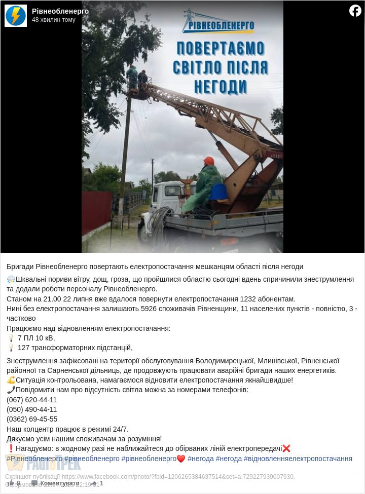 Знеструмлення були зафіксовані на Володимиреччині, Млинівщині, а також у Рівненському та Сарненському районах.