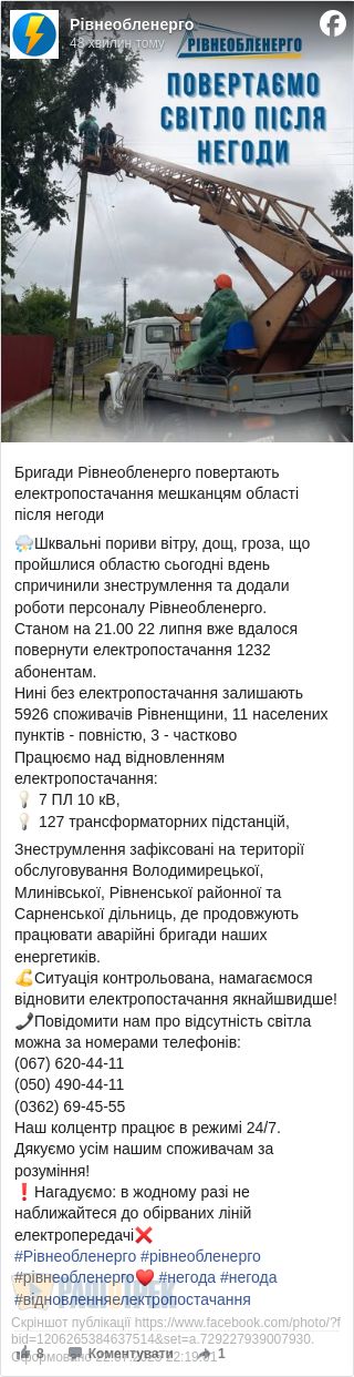 Негода, яка сьогодні пронеслася Рівненщиною, повністю знеструмила 11 населених пунктів, та три – частково.