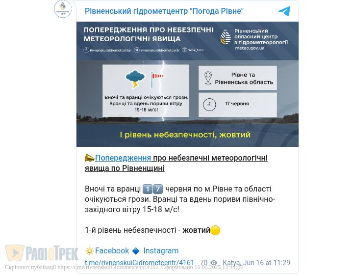 Вночі та вранці очікується короткочасний дощ з грозою, а вдень буде без істотних опадів. Вітер – західний, північно-західний, 7-12 м/с, а під час грози можливі пориви до 15-18 м/с, повідомили у Рівненському гідрометцентрі.