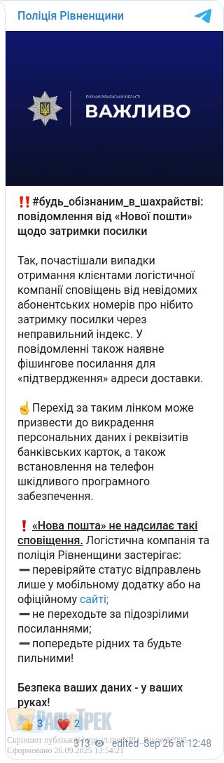 На Рівненщині активізувалися шахраї, які надсилають клієнтам «Нової пошти» фейкових SMS про затримку посилки.