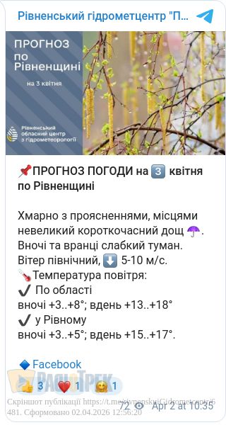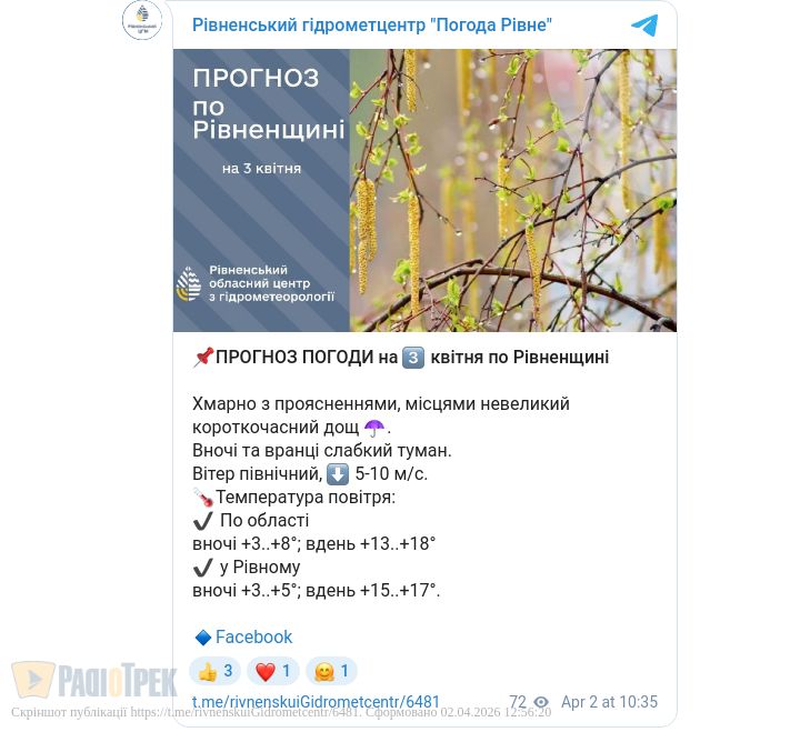 Завтра, 3 квітня, у Рівному та області буде хмарна погода.
