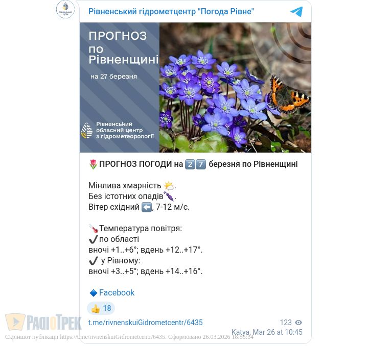 Завтра, 27 березня, у Рівному та області очікується мінлива хмарність.