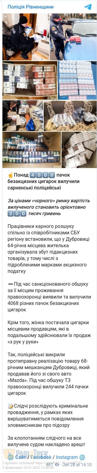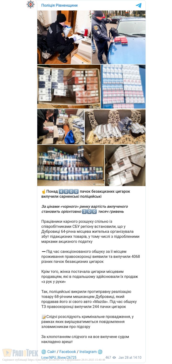 Під час обшуків у фігурантів загалом вилучили понад 4000 пачок підакцизних товарів. Нині вирішується питання щодо накладення арешту на вилучений товар. Слідчі дії тривають.