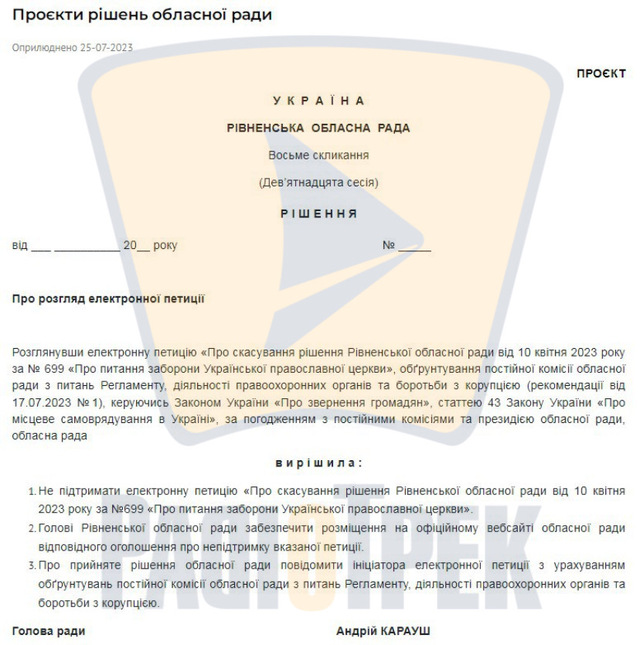 Голова облради Андрій Карауш уже розглянув петицію. За рекомендацією комісії з питань регламенту, діяльності правоохоронних органів та боротьби з корупцією, обласній раді пропонують звернення не підтримувати – через антиукраїнську та антидержавну позицію упц мп.