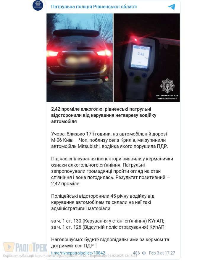 На Рівненщині зупинили п'яну, як чіп, водійку: вона заплатить майже 20 тисяч грн штрафу