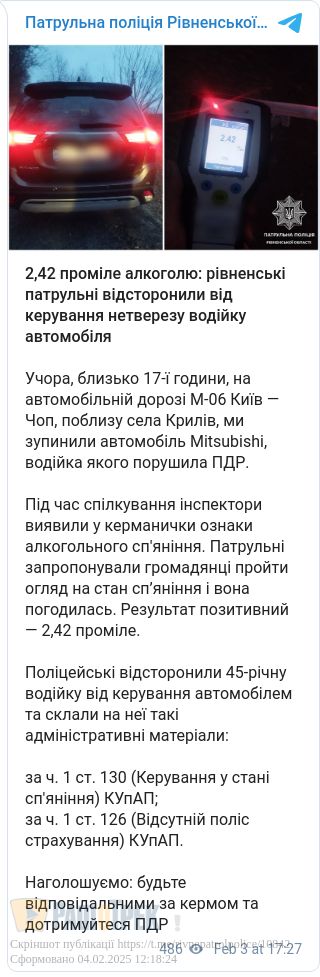 Кермувальниця Mitsubishi порушила правила дорожнього руху. Під час спілкування інспектори помітили у жінки ознаки алкогольного сп’яніння.