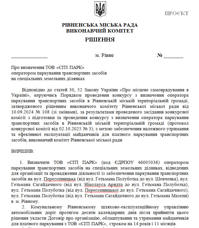 Стало відомо, хто буде оператором паркування у центрі Рівного. Йдеться про ділянки на вулицях Пересопницькій, Сагайдачного та Полуботка. Там платні парковки облаштує ТОВ «СІТІ ПАРК», про це йдеться проєкті рішенні виконкому.