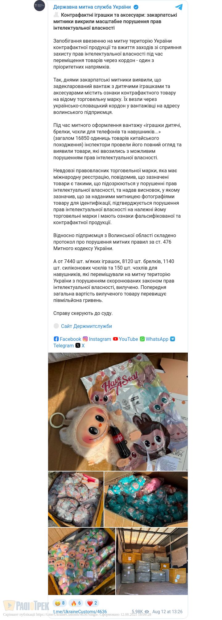 Днями на Закарпатті митники виявили задекларований вантаж з дитячими іграшками та аксесуарами, що містить ознаки контрафактного товару на відому торгівельну марку «Лабубу».